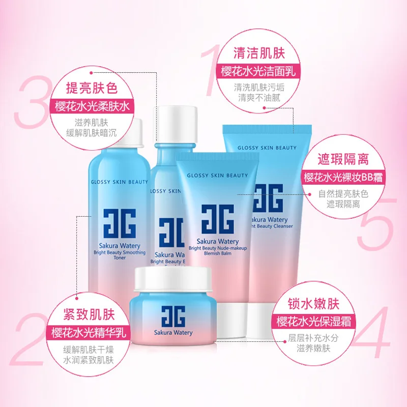 HOT Sale Beauty Cherry Facial Care Set Hydrating Bright Cleanser+Emulsion+Toner+Moisturizing Cream+Natural B