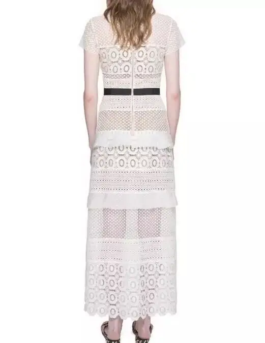 HIGH QUALITY Summer Style Short Sleeve Pure White Lace Long Dress Women Lace Patchwork Sexy Hollow-out Beautiful