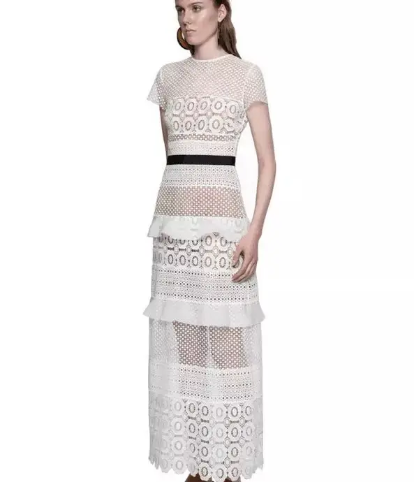 Summer Style Short Sleeve Pure White Lace Long Dress Women Lace Patchwork Sexy Hollow-out Beautiful